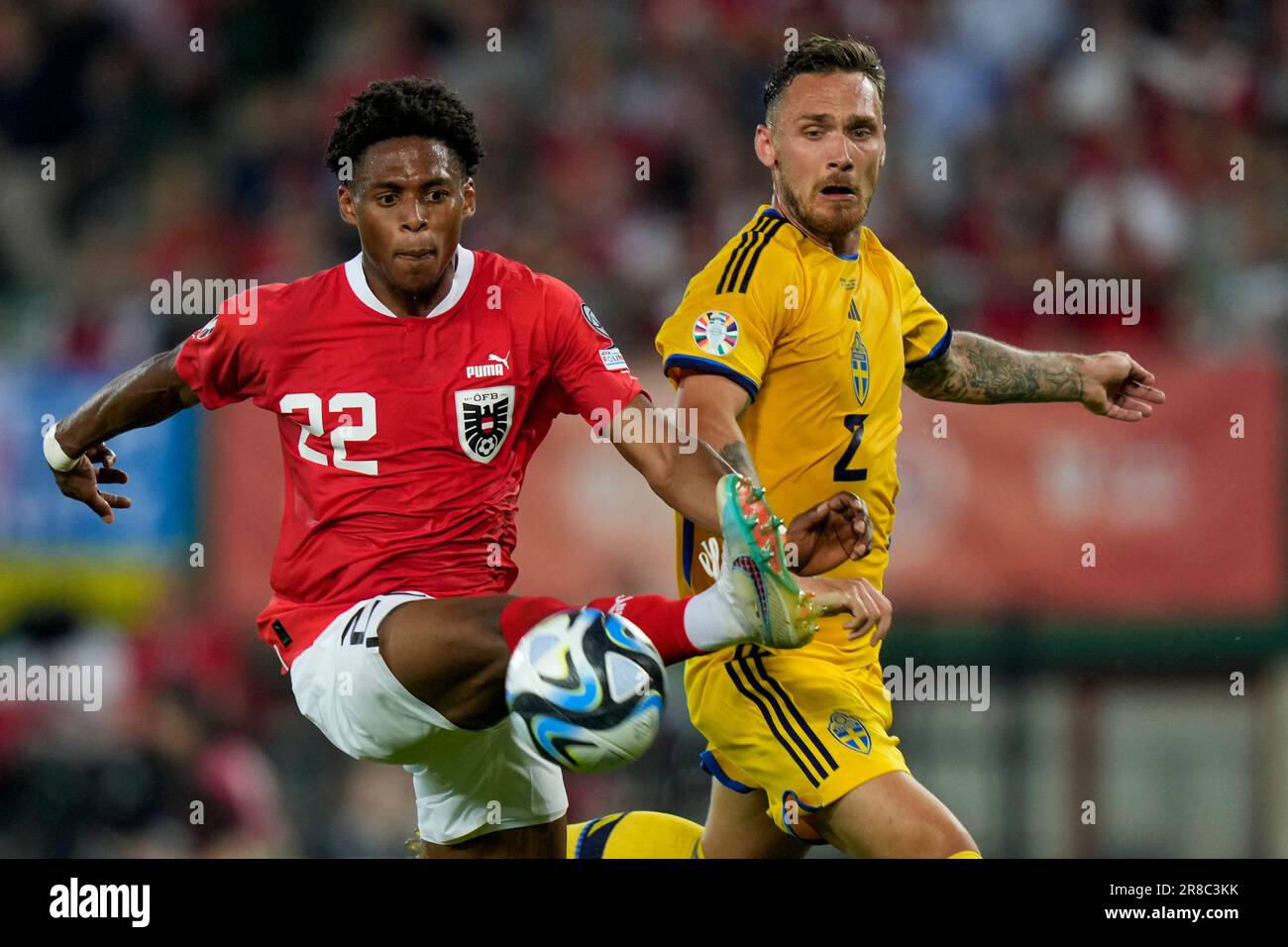 Austria’s Junior Adamu, left, duels for the ball with Sweden’s
